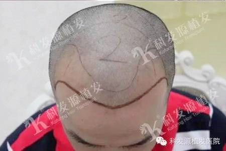 术前设计:科发源专业的美学设计师根据杨先生的脱发情况,设计出最符合他个性的植发区发型,图中可以看出植发区分为了3个部分,1处使用FUE技术对脱发区进行填充,2、3处使用PTT稀疏加密型技术进行“见缝插针”般种植,这足以说明科发源的专业性。