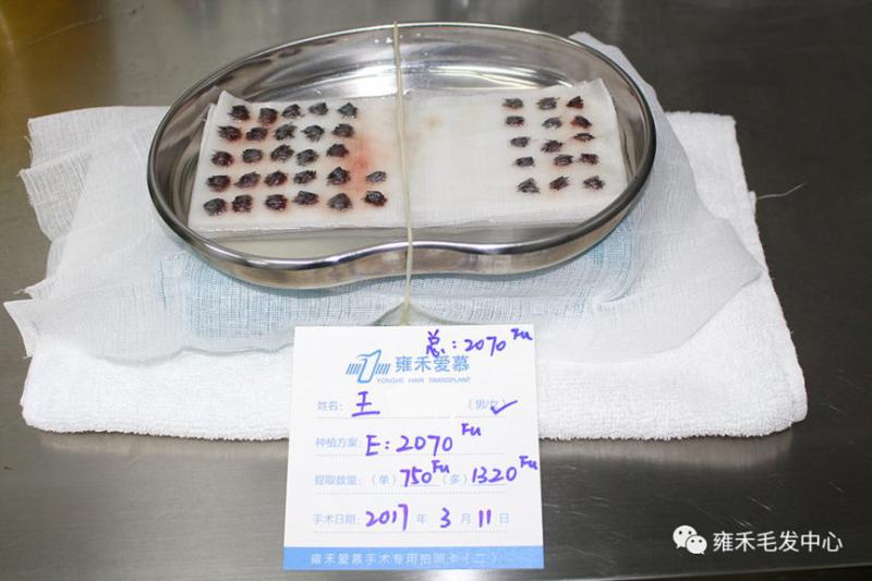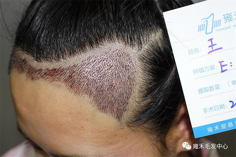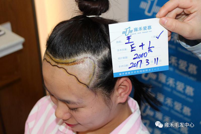 2017年3月11日,沈阳雍禾用FUE为小王植发2070单位,含单根头发的毛囊单位750,含多根头发的毛囊单位1320,本来术前预估种植2000单位,结果多取种70单位。大家看一下后面的图片,对一个女性来说2070是较大种植量,只因她的两个额角种植面大。整个手术3小时多,只是打麻药小疼,其它时间大体舒适。