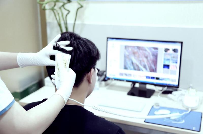 使用专业毛囊检测设备,对供区(取发区,通常后枕部)和受区(脱发区)进行全面分析。