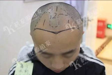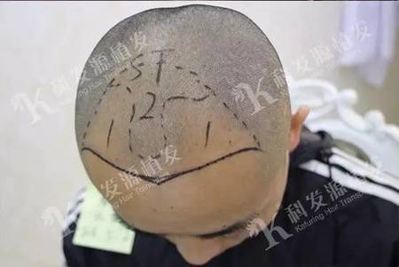 术前设计:科发源资深美学设计师根据薄先生的脱发情况、脸型和美学标准设计了最适合他个性的植发发型。可以看出发际线设计非常清晰、合理。图中分成1和2两个区域,并且区分部位并不是平滑的曲线,这进一步说明了,术前设计师的责任心,为完美的术后效果打下良好的基础。