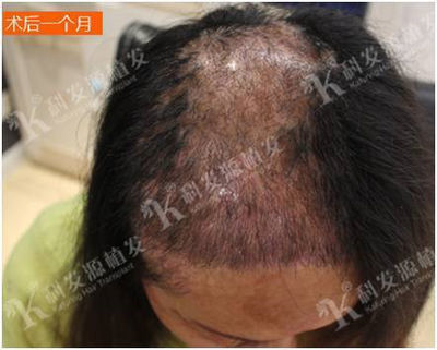 (术后一个月:和术前的对比一下,之前裸露的头皮是“白色”的,现在是“黑色”的,现在可以看到种植下去的头发,已经开始生长,而且长势良好。)