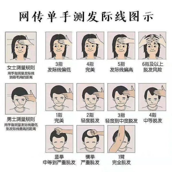 也叫单手测发际线法,即用手掌测发际线到眉毛间的距离。