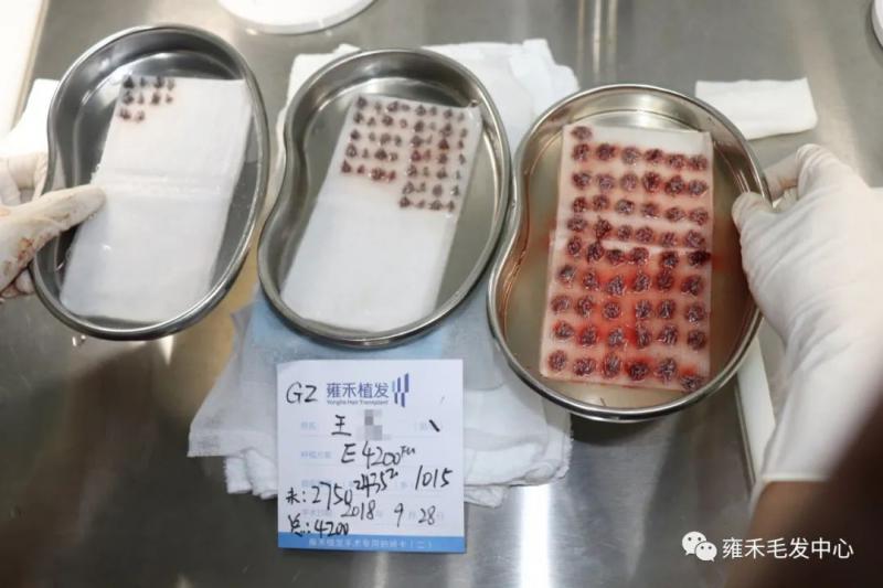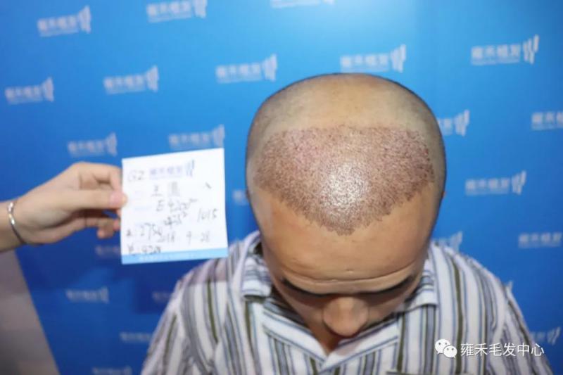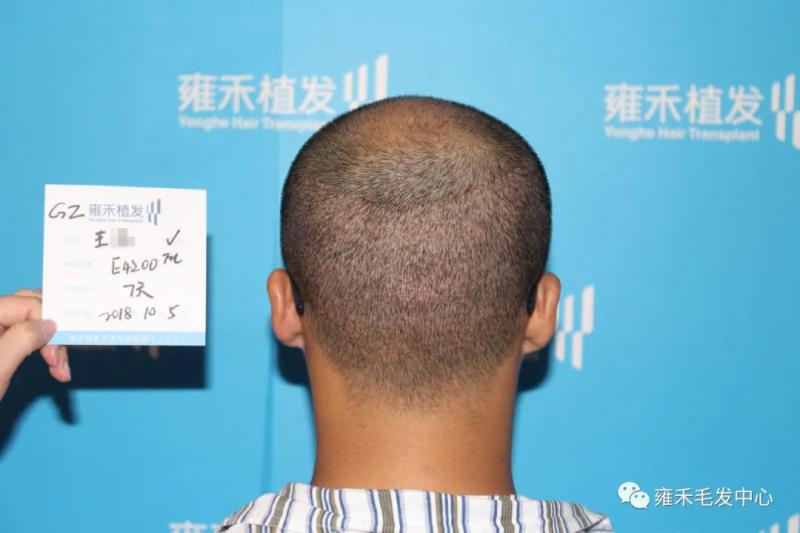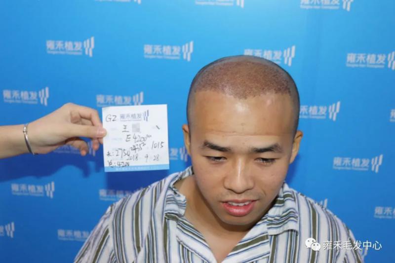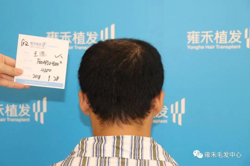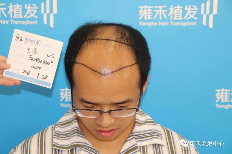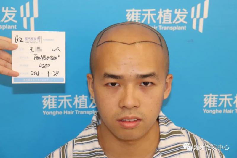 2018年9月28日,广州雍禾采用FUE为小王植发4200单位,手术从12点10分开始,下午18点40结束,总共6小时半。注意看,种植区只是前面的完全裸露区,也就是毛囊坏死区,往后的部分没有种植,这部分有少量的细软头发,主要也是毛囊坏死,关于后面没种的部分,一个是术后用米诺地尔让细软头发健壮些,一个是二次植发时补种。