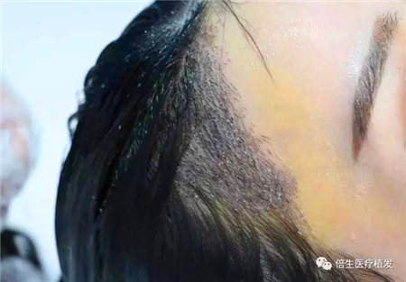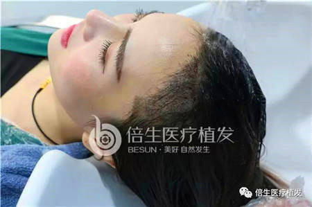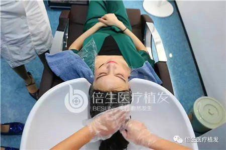 首先,用花洒将种植区泡软,然后洗发水倒入手心打出泡沫,然后轻轻拍洗种植区域和后枕部位置。