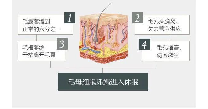 毛囊出现萎缩,一般长出的都是有些扭曲营养不良的小细毛。