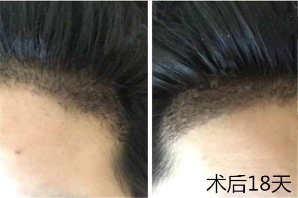 接下来就是发际线调整的恢复过程了。术后五到十八天,血痂大部分脱落,可以看到种植的头发。