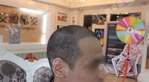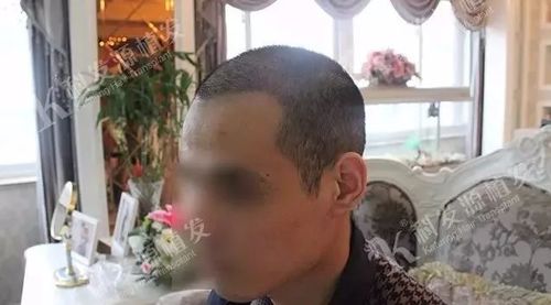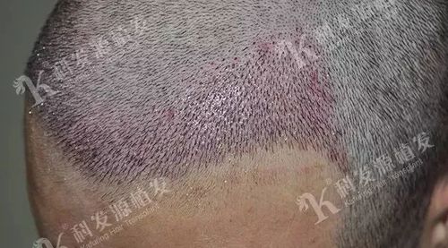 植发当天的效果:血痂很少,肿胀几乎没有。自然的毛发生长是每个单位1-3根毛发,纵横交错,不会成行,竖排列。从图中能看到头发茬也均匀的分布在种植区域,十分的自然。