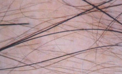 皮肤镜可将头皮、毛发高倍放大,并将显示图像呈现在电脑中。雄性激素源性脱发的脱发区域在皮肤镜下,最主要的特征是:毛干直径变小,毳毛数量增加,甚至出现局部无毛症。