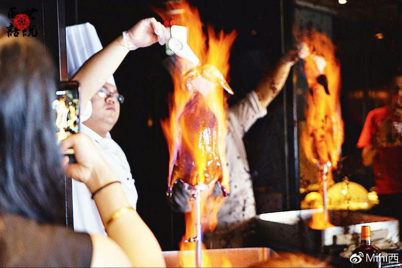 这个烤鸭是他们的特色菜,一定要尝试!!一整只串在架上的鸭子被推到包厢中,厨师现场过一下火,这香味与视觉的双重冲击,一下子就带动了我们的食欲。而那味道也绝对不会让你失望的。