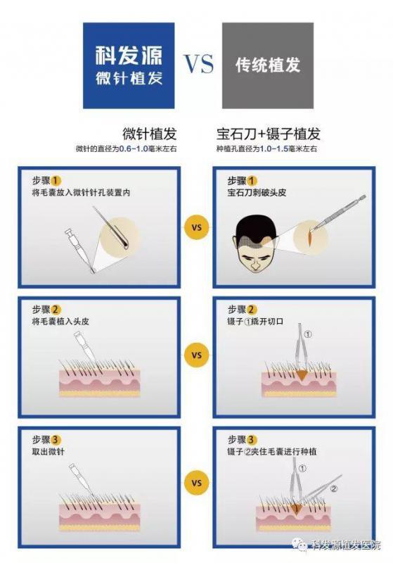 目前国内主要使用的两种植发技术是科发源的微针植发技术和传统宝石刀 镊子植发技术,先来看看这两种技术的植发手术步骤区别: