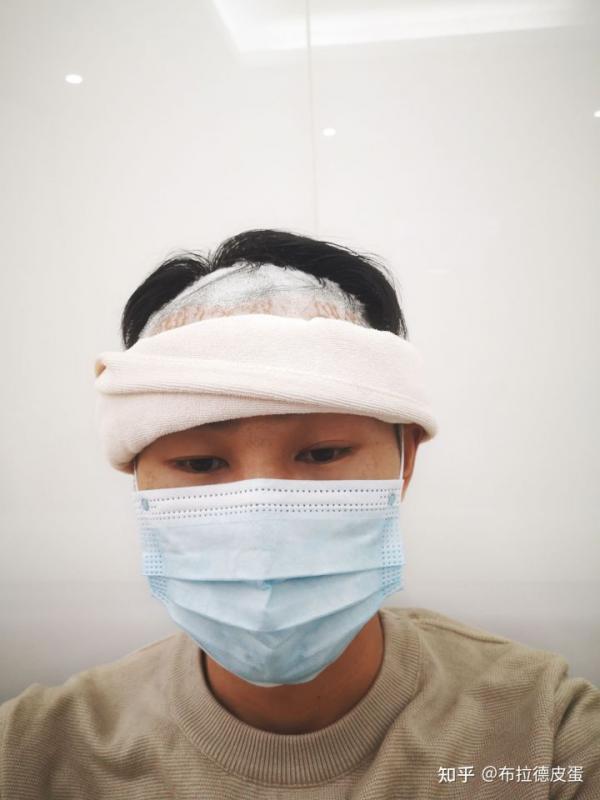 估计流了不少血,脑袋上那么多孔,护士给用不知是不是生理盐水啥的冲洗清理后就结束了。用镜子看了下还可以,然后脑取发区裹着纱布绷带,套着无菌帽就出来了。看了下时间,居然用了四个小时左右。加上取发,这次植发历时六个多小时。