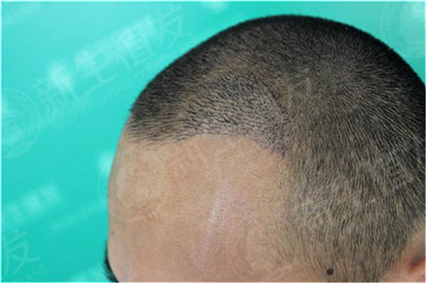 术之后一个星期后,郑先生来医院复查,额角的毛囊中长出了发茬,大约一厘米的长度,血痂大部分脱落,没有任何伤,就和正常长出了的头发一样。