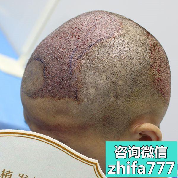 【秃顶植发术后第5天】植发术后第五天,后脑勺提取部位已经长出头发了就是有些短小短小的,看的不是很清楚,可以把图片方大来看。头顶的血痂有的已经慢慢的脱落的,长出新发,感觉有新生的感觉,很美好。