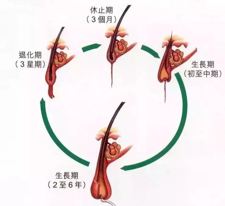 正常毛囊周期循环往复,一般需要经过生长期2 ~ 8年、退行期4 ~ 6周、休止期2 ~ 4个月和脱出期。脱出期是自毛干脱出后至下一个周期的新毛干长出为止,为休止期晚期和生长期早期。