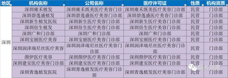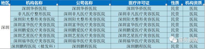 备注:深圳艺星、深圳鹏程、深圳阳光等整形美容医院是全国连锁整医疗机构,除了植发手术,还有 注射美容、眼部整形、面部整形、鼻部整形、抽脂等等科室。