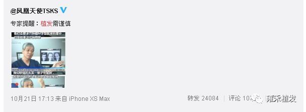 此后有关植发的话题一直冷冷清清,偶有微博谈及植发,转发量也就几百吧,算不上火。2018年10月21日,网名“凤凰天使TSKS”发布一条微博:专家提醒,植发需谨慎。不料这条微博火起来,不到24小时,转发量2.4万,评论量破万,加上其它一些微博复制粘贴,这条微博的内容转发量应该破3万,阅读量估计几千万之多。虽比不了杨幂的那条微博,但仍然是火微博,至少是2018年有关植发话题最火的一条微博。