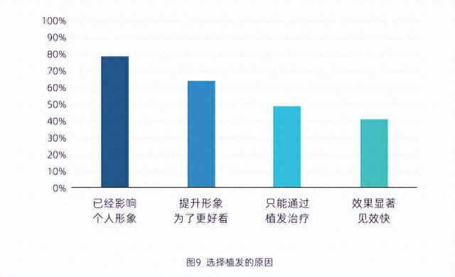 “变美”意识已经根植于消费者认识,《蓝皮书》显示,毛发健康问题主要影响个人形象和自信心。在选择植发的群体中,79%的消费者认为影响到个人形象的时候需要植发,64%的消费者认为植发可以提升自己的形象,让自己更好看。