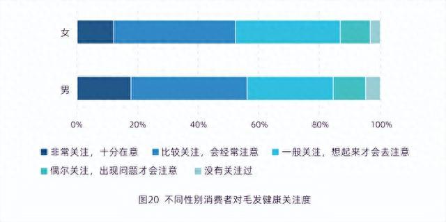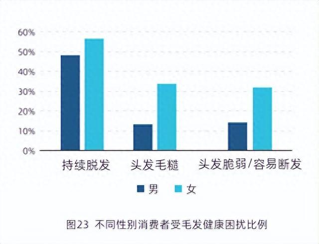 在对美的追求上超越男性消费者的同时,女性消费者已经成为毛发健康市场中异军突起的力量。《蓝皮书》显示,96%的女性消费者关注自身的毛发健康。女性消费者在养发和预防脱发的问题上比男性关注度更高,56%的女性面临持续脱发的困扰,30%以上的女性的毛发存在毛躁、脆弱、容易短发等问题。