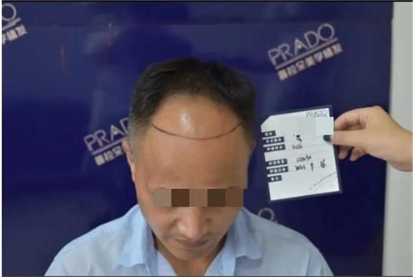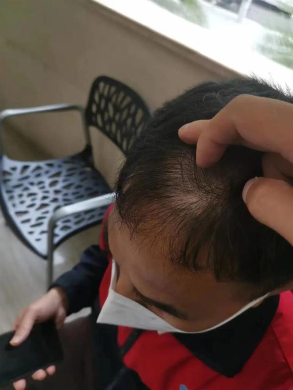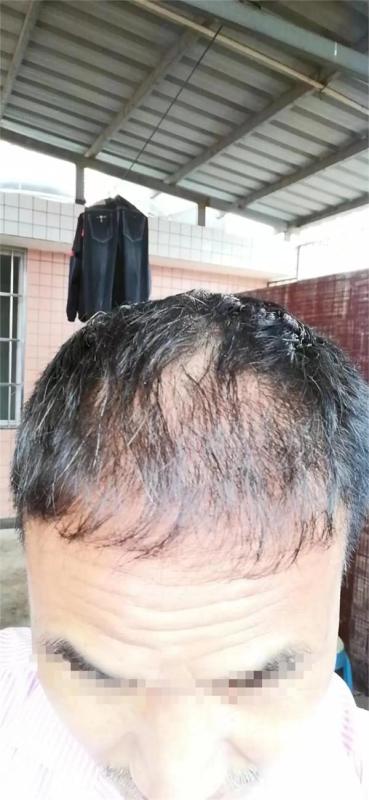 邓先生之前从事装修工作,后来在工厂上班,在几年开始有脱发现象,导致前额上方的区域头发都掉光了,发际线非常高。