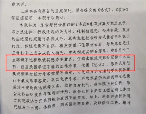 该案在今年2月28日进行了宣判。法院审理后认为,原告主张被告植发毛囊存活率低于约定、移植毛囊不自然、植发效果不佳影响面容,导致原告无法正常打卡上班造成收入损失、被告指定其购买药品、被告手术卫生环境不达标致使其感染毛囊炎,但均未能提交充分证据予以证明,应当承担举证不能的法律后果。