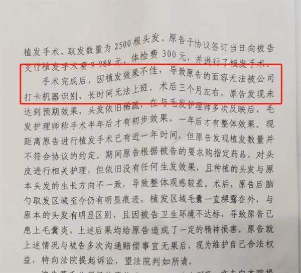 邓先生在起诉状中还写道,“手术完成后,因植发效果不佳,导致原告的面容无法被公司打卡机暴识别,长时间无法上班。”