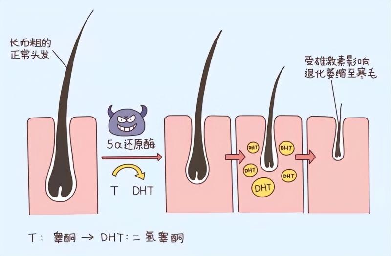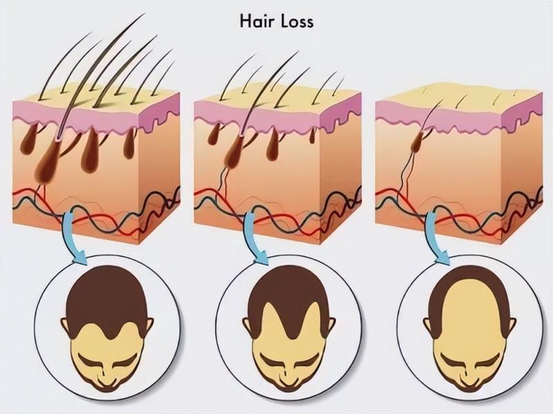 从脱发的机制来讲,毛囊在脱发的过程中起到了关键的作用。近年来的研究表明,雄激素性脱发引起了毛囊的退化,即毛囊微型化,具体表现为脱发区域的毛发逐渐变细变小,颜色变浅,并且从长而粗、颜色深的最终毛发逐步变成短而细、质地软、颜色较浅的毳毛,长期发展,毳毛脱落,毛囊萎缩消失,头皮裸露。