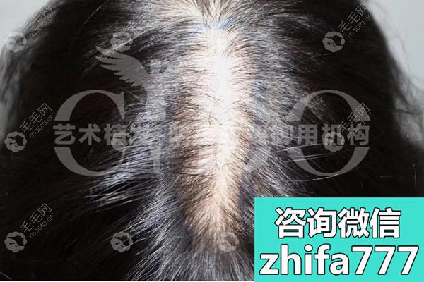 而女性脱发大多就像这位女性一样呈发缝稀疏弥漫性脱发!