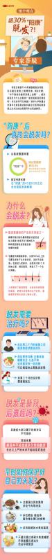 超30%“阳康”有脱发风险?该话题迅速登上微博热搜,网友吐槽,“本不富裕的脑袋顶雪上加霜”。清华大学附属北京清华长庚医院皮肤科副主任医师段晓涵表示,从临床数据来看,“阳康”中约31.3%的人出现了休止性脱发,每天掉发超过100根,其中女性占到了73%。在“阳康”后45至60天左右,会出现脱发高峰期。