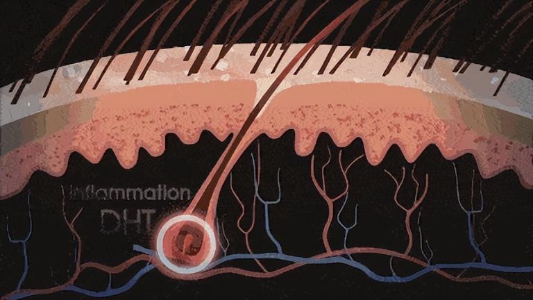以脂溢性脱发为例,脂溢性脱发占了脱发的90%。这是由于头皮一些部位的毛囊会在雄性激素代谢物二氢睾酮(DHT)的刺激下提前萎缩和退化导致头发脱落,待到性成熟后雄性激素分泌增多,脱发就发生了。因此我们知道,脱发的根本原因,是DHT对毛囊造成刺激损坏所致。