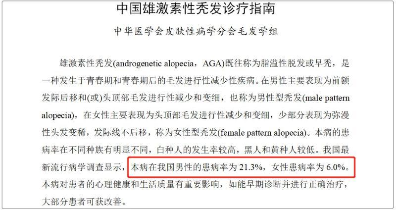 雄激素性脱发名字带个“雄”,但可不意味着女生就可以高枕无忧。《中国雄激素性秃发诊疗指南》就指出——我国男性雄脱患病率约为 21.3%,女性约为 6.0%。