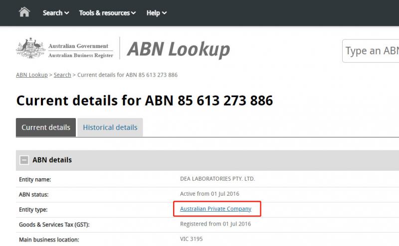 公开信息显示,Ficcecode品牌在2017年始创于澳大利亚,生产企业名为“DEA集团公司”。燃财经从澳大利亚工商局政府官网上找到DEA集团公司的工商信息,显示其为一家私营公司,且在2016年7月1日便已注册。除此之外,这家公司在网上查询到的信息十分有限。