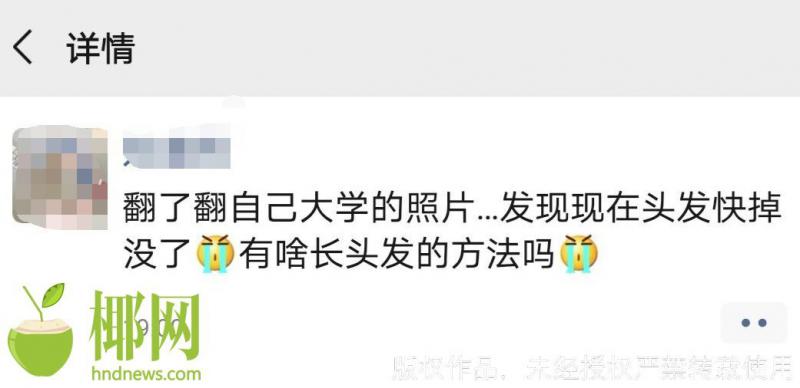 与刘雨因为工作原因经常熬夜导致脱发不同,王丽觉得她的作息很规律,无任何不嗜好。但她翻了翻自己大学时的照片,却发现和那时的自己相比,发量有了明显的减少。11月4日晚,王丽还发了一条朋友圈向微信好友讨教起生发小技巧。