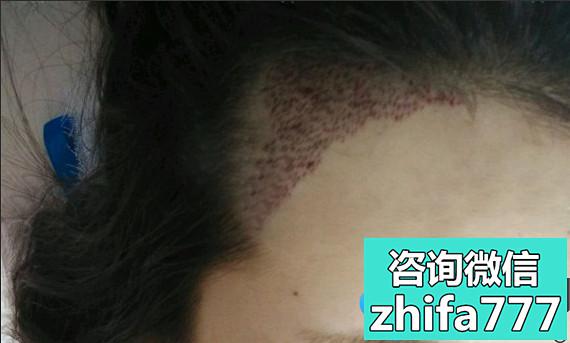 上面这张图是我刚做植发手术后照的。我的脱发面积并不大,总面积加起来差不多有五六个一元硬币那么大,所以两个额角一共种植了500毛囊单位就差不多了。