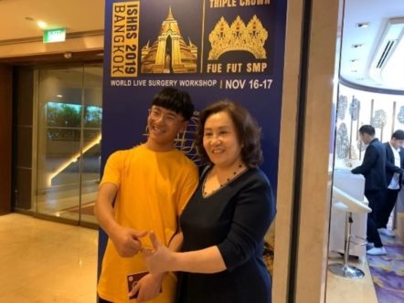 创始人尤丽娜(右)在世界植发大会展示疤痕植发案例