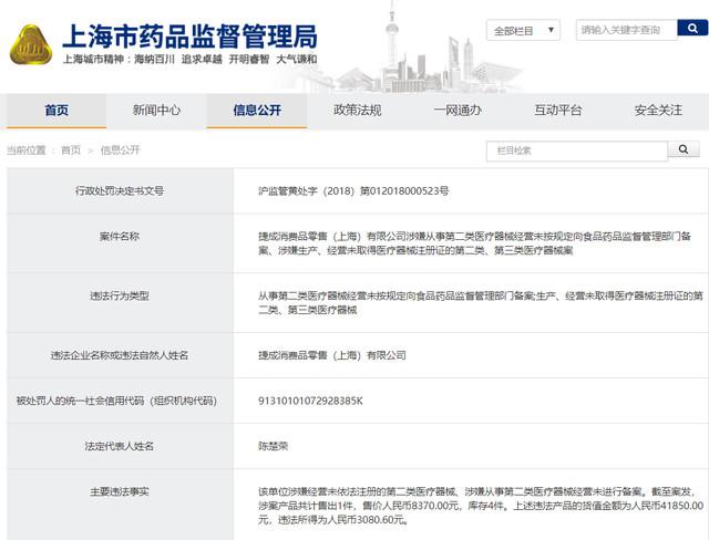 据了解,上海市黄浦区市场监督管理局就曾对,捷成消费品零售(上海)有限公司发布过行政处罚决定书。