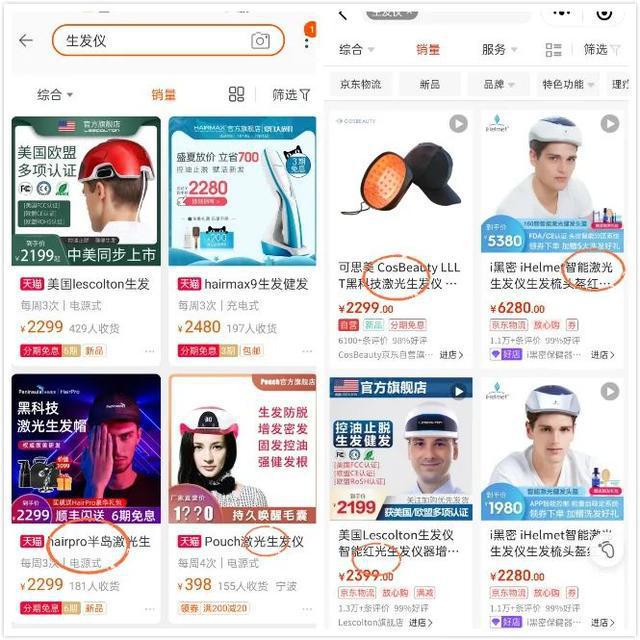 我们以“生发仪”为关键词,在淘宝、京东上进行搜索,并以销量从高到低排序,发现排名靠前的几款产品,均在标题中标有“红光生发仪”或“激光生发”字样。