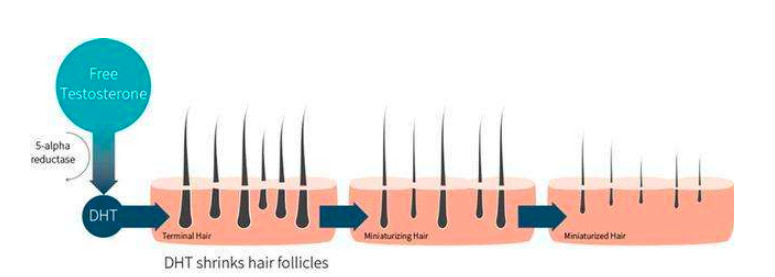 首先我们应该知道DHT的形成机制,雄秃患者天生自带“Ⅱ型5α还原酶”,可以使睾酮转化为DHT,DHT使毛囊萎缩,从而引起脱发。所以想要抑制它,就要从根源解决,非那雄胺的作用就是抑制“Ⅱ型5α还原酶”,使睾酮无法转化为双氢睾酮,从而达到治疗脱发的目的。