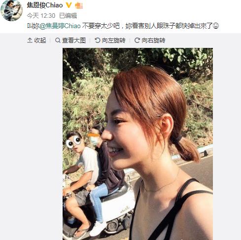 焦恩俊和女儿焦曼婷的父女关系一直都挺好,而且时常会更博互动。这不,中午的时候,焦恩俊还晒出一张照片,焦曼婷在走着,旁边骑电车的小伙子一直盯着焦曼婷看。而焦恩俊还晒照调侃说叫你不要穿太少吧,你看害得别人眼珠子都快掉出来了!哈哈,是啊,这穿得确实有点少了吧!