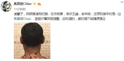 半夜焦恩俊再次晒出焦曼婷剪得这头发照片说:“这辈子,我娘摸过我的头,在来前妻,后来王总,老年时,没想到接手的是焦曼婷,谢谢你帮我剪头发,你知道的,爷的头不能随便摸!”