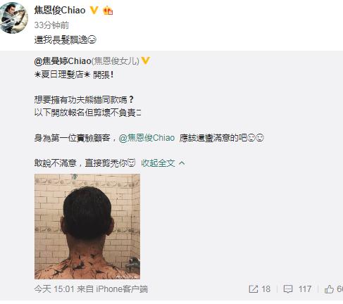 到了下午,焦曼婷还给爸爸焦恩俊剪起头发来了!焦曼婷晒出剪过头发的焦恩俊后脑勺说夏日理发店开张,还问想不想拥有功夫熊猫同款的发型?开放报名,但是剪坏了不负责,而这实验的第一位顾客是焦恩俊。并且还直言敢说不满意直接剪秃!哈哈,这个女儿蛮横的很呀,而焦恩俊半夜回应说要焦曼婷还他长发飘逸!