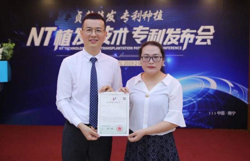 发布会现场,贞韩集团郝帅院长接过专利技术顾问手上的专利技术证书,完成交接仪式。