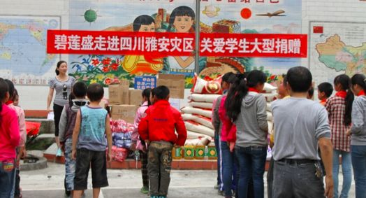 2013年,雅安地震发生后,碧莲盛赶赴灾区学校捐款捐物。