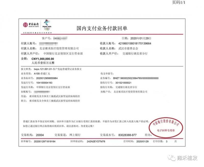 (雍禾给武汉市慈善总会捐款100万元凭证↑)