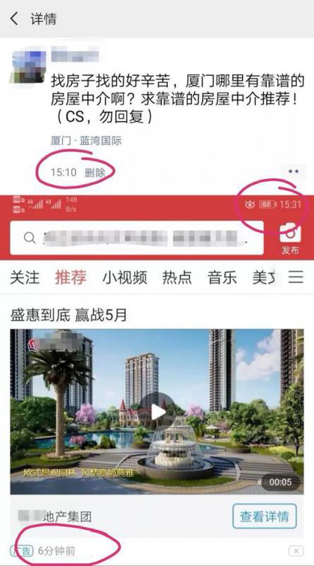 记者在测试中发现,在某社交APP中发布一条有关房屋买卖的信息,15分钟后某地产企业广告就出现在另一款资讯类APP中的首页广告中。