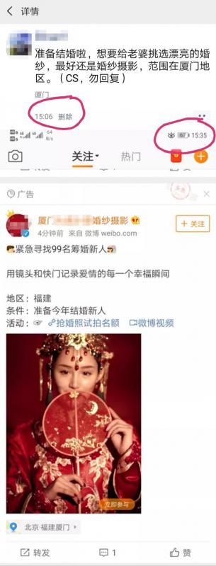 在另一组测试中,记者在某社交APP中发布了有关“婚纱摄影”的信息,约半小时后打开另一款社交APP,记者测试所在地的婚纱摄影广告即“扑面而来”。