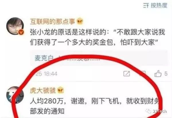 对此腾讯张军已经辟谣:人均280万那是不可能的,不过年终奖确实有增加。