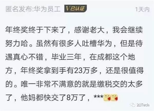 有网友爆料称自己是华为的员工,今年年底发的奖金为32万,由于交了8万的税,剩下23万, 抱怨税实在是太多了。随即有网友表示,他交的税都顶自己一年的工资了。