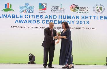 全球人居环境论坛主席、联合国前副秘书长暨高级代表安瓦尔·乔杜里大使为尤丽娜女士颁发“全球人居环境杰出妇女领袖奖”奖杯