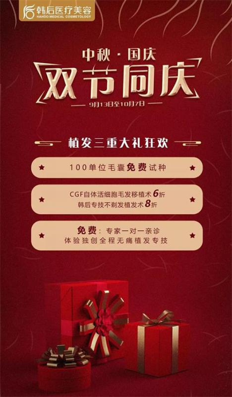 不过现在韩后整形·双节同庆期间植发三重大礼狂欢,有植发需求的宝宝可以选择在这段时间来哦~