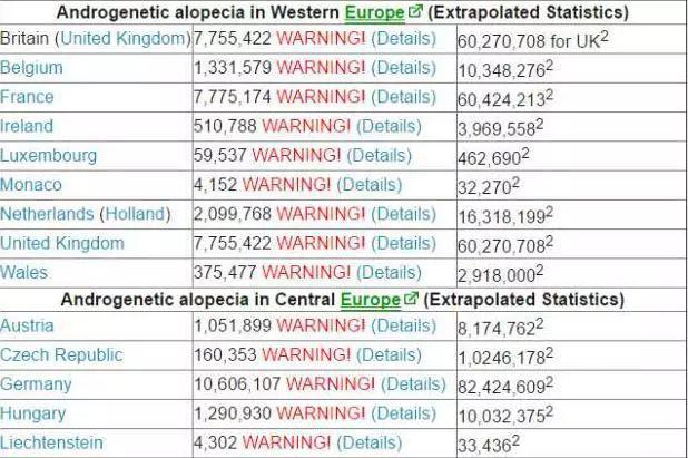 日本紧随欧洲和北美之后,以26.78%的秃顶率排在第14名,也就是说,日本有1800万秃顶的人群,男性占到1300万,说明日本秃顶的人也是大有人在啊!下图是欧洲地区脱发情况的一个数据图。